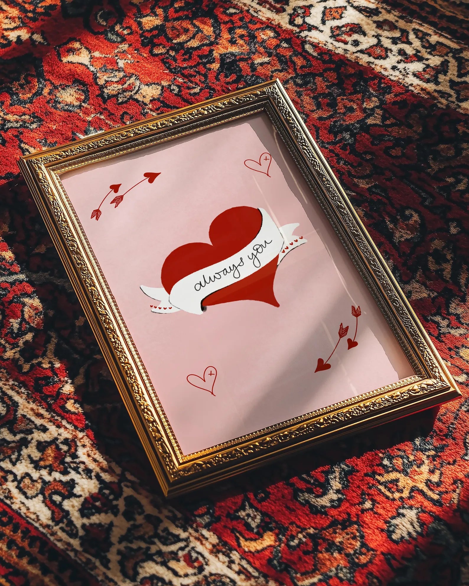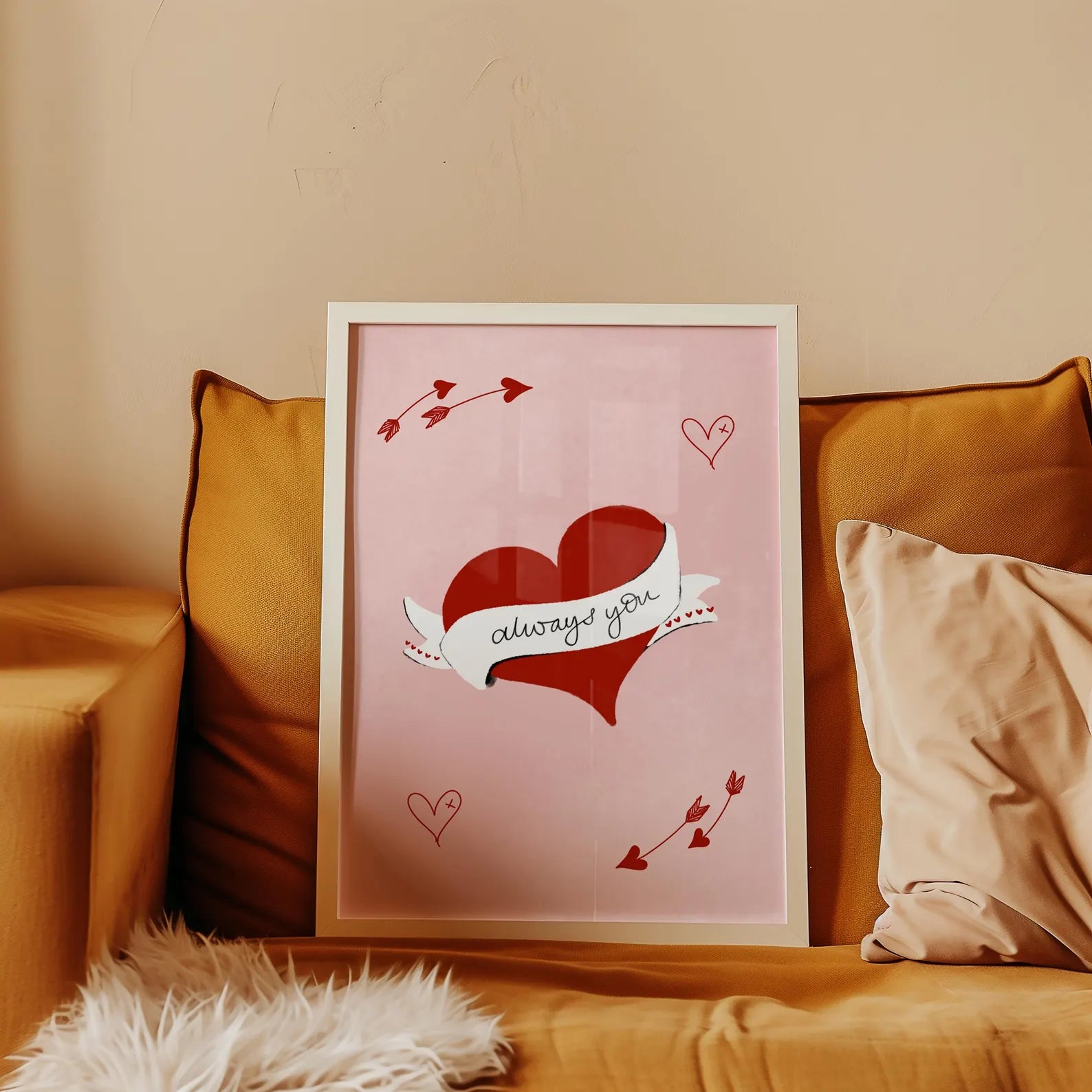 Hand drawn valentines day wall art print poster gift for her. Illustrated love heart in red with hand written "always you" text hand written on it with graffiti style hearts and cupids arrows on a pink background.