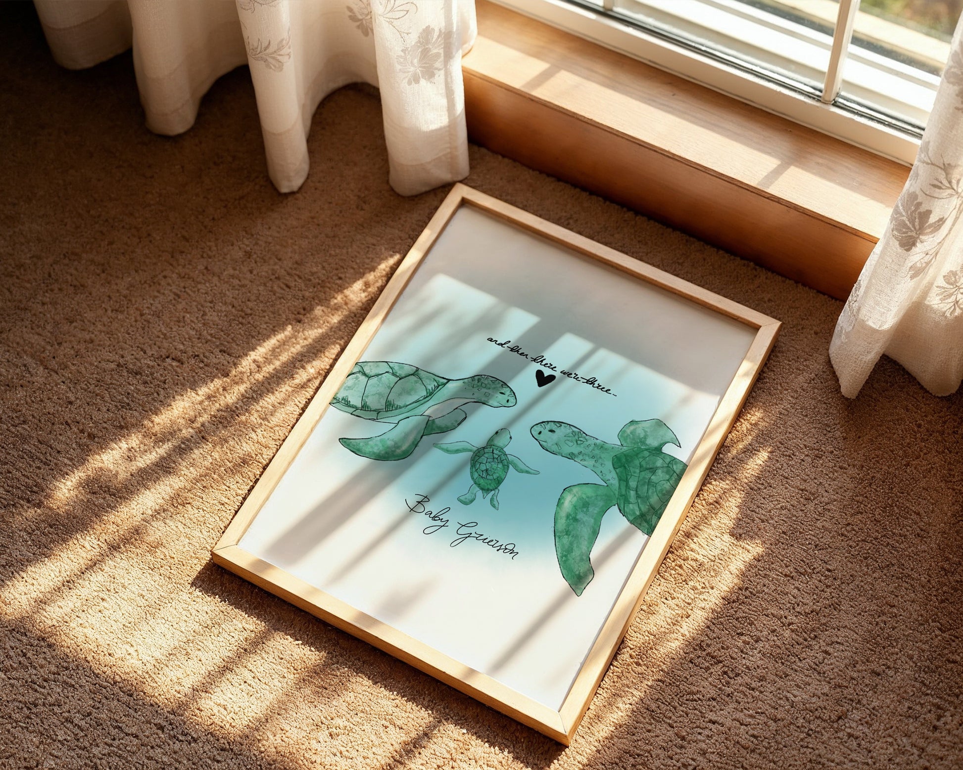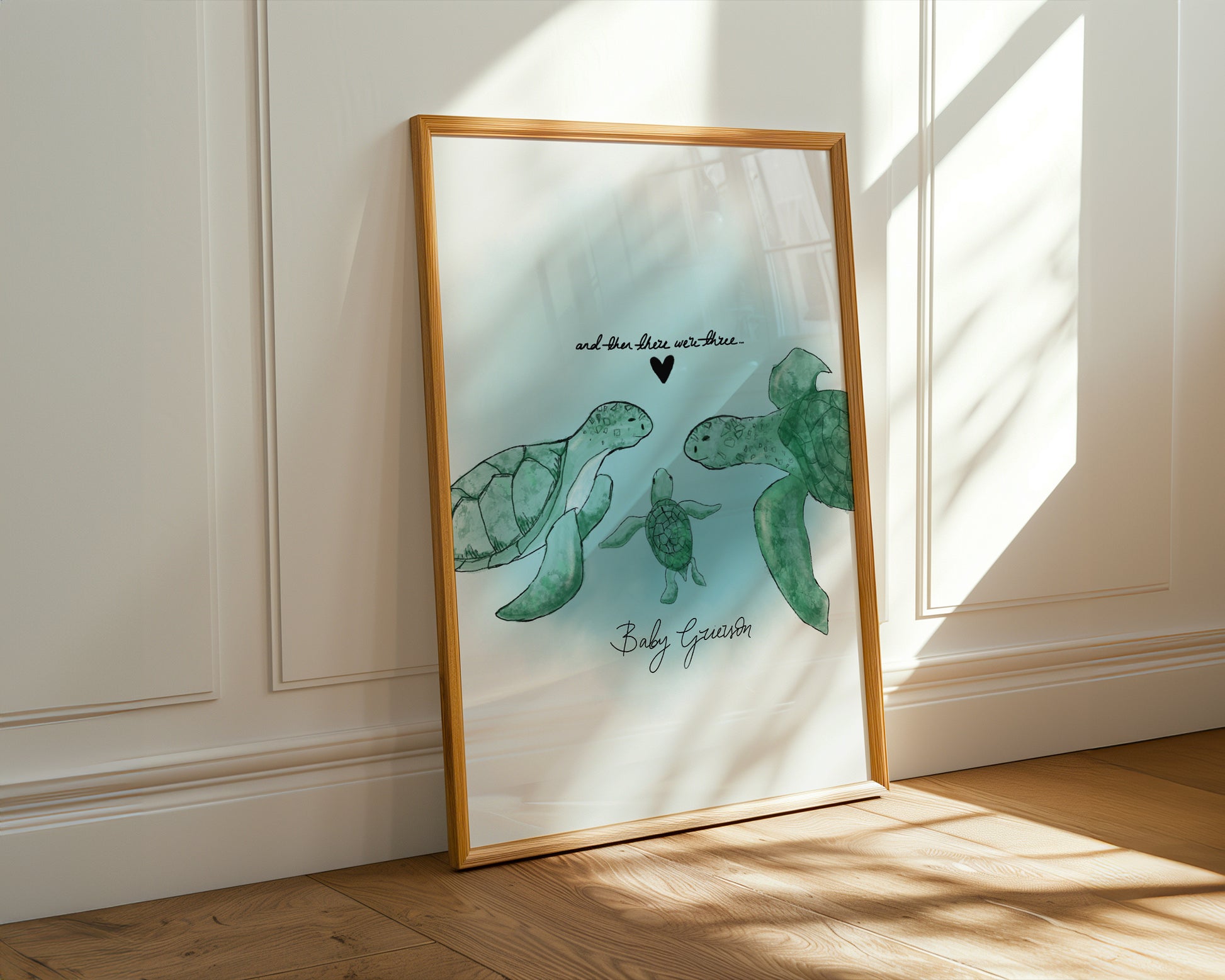 New born baby wall art print gift featuring turtles and the phrase “and then there were three,” created as personalised poster art for a nursery or children’s bedroom with a sea theme. May include: a framed illustration of a turtle family with two adult turtles and a baby turtle, detailed in soft ocean colours with a small black heart above the text. A perfect baby announcement gift, baby shower present, christening keepsake, sea life nursery décor, personalised family artwork, and charming newborn room decoration.