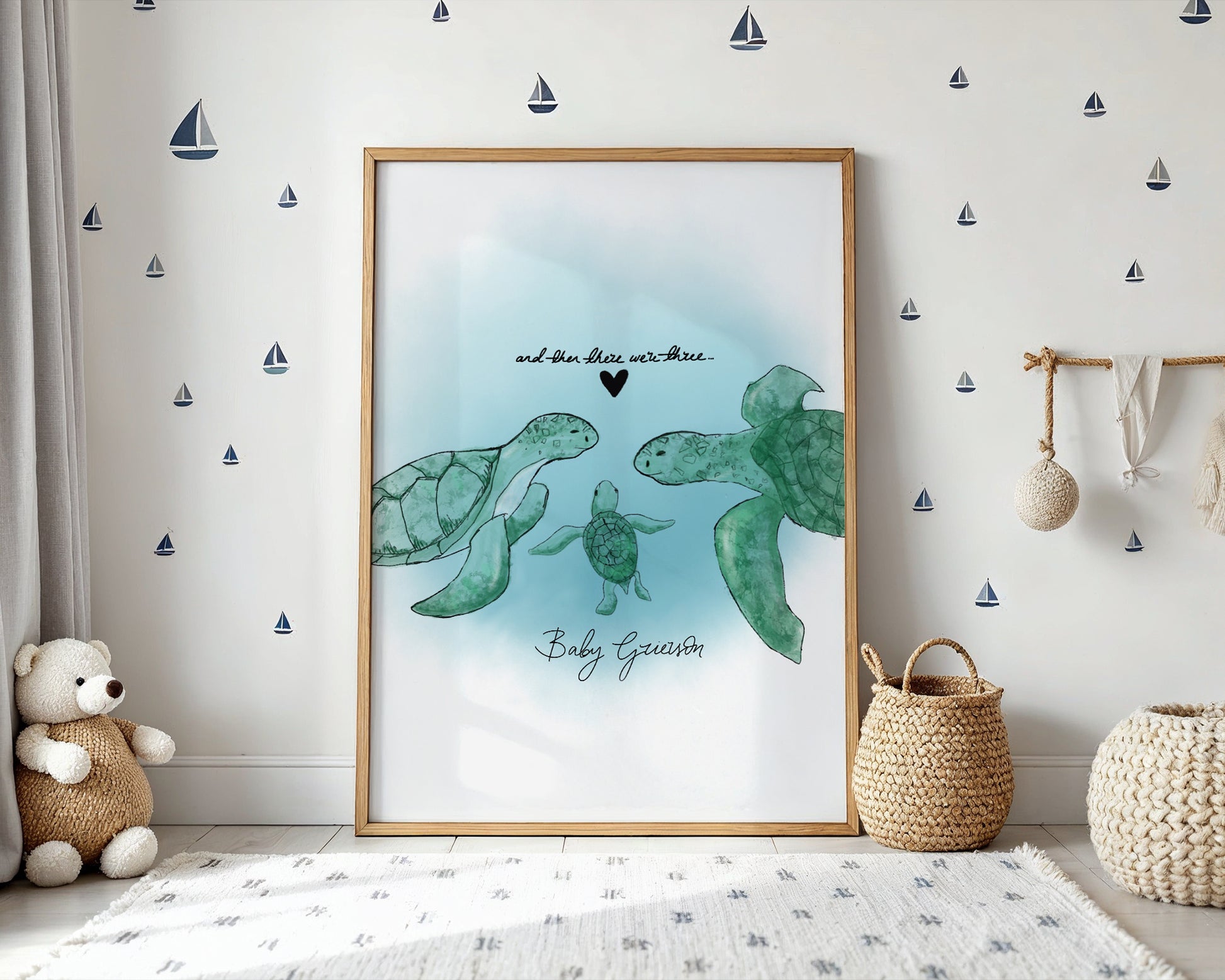 New Born Baby Print Gift With Turtle "And then there were Three" Children's Sea-themed Art