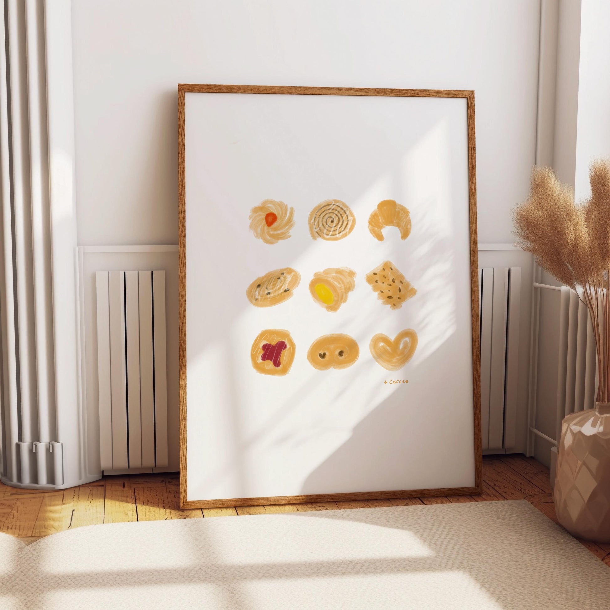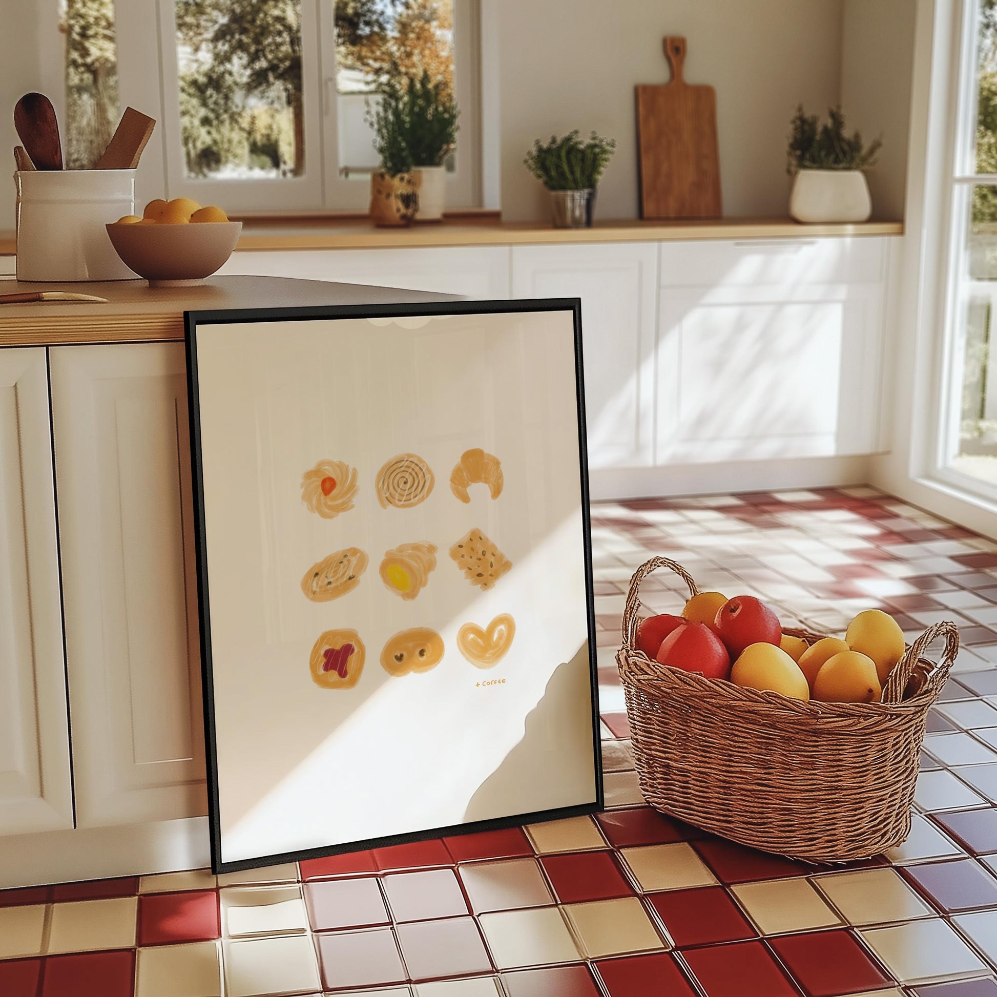 A part of our hand drawn food illustration series. A perfect wall art print to add some cafe character into your kitchen, featuring breakfast pastries such as Cinnamon Swirls, Pain au chocolat, Croissants, Danish Pastries and other baked goods. - Can you guess them all? Handwritten + Coffee text underneath (of course).